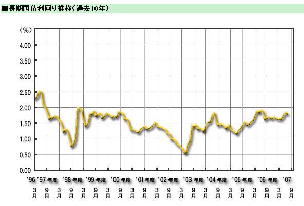 これは、米国のサブプライムローン問題で日本の株式が荒れたため、安定的な債券に投資先がシフトしてしまったためでしょうか(債券が買われる>債券価格が上がる>利率が下がるという関係です)。