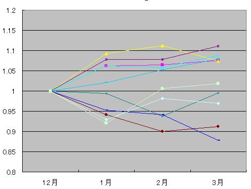 (過去10年の12月初値から翌年3月初値の動きを12月を1として比較)
