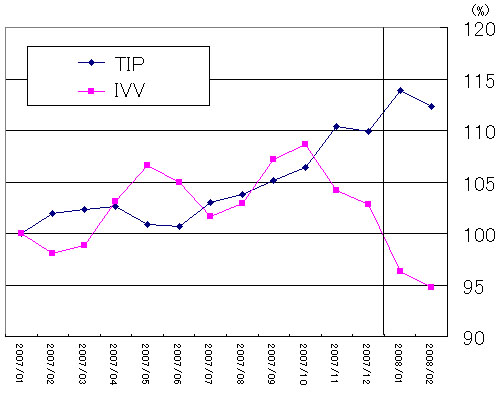 昨年後半より株式市場が低迷する中で、債券ETFが脚光を浴びている。昨年のS&P500指数が5.63%の下落となる一方で、iSharesの「リーマンTIPS債券ファンド」(ティッカー:TIP)は15.82%のリターンを出した。