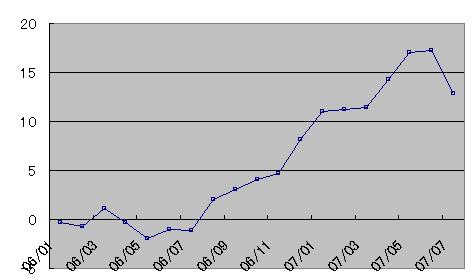 今月の成績ですが、月末の米国発サブプライムローンショックが、かなり影響し 4.3%もダウンしてしまいました。 せっかく積み上がっていた利益ですが4月の水準に戻っています。
