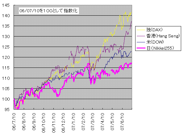 右図に、米、独(ヨーロッパ代表で)、香港(アジア代表で)、と日経225を並べたチャートを描いてみました。日本株はなかなか上がってませんねー。